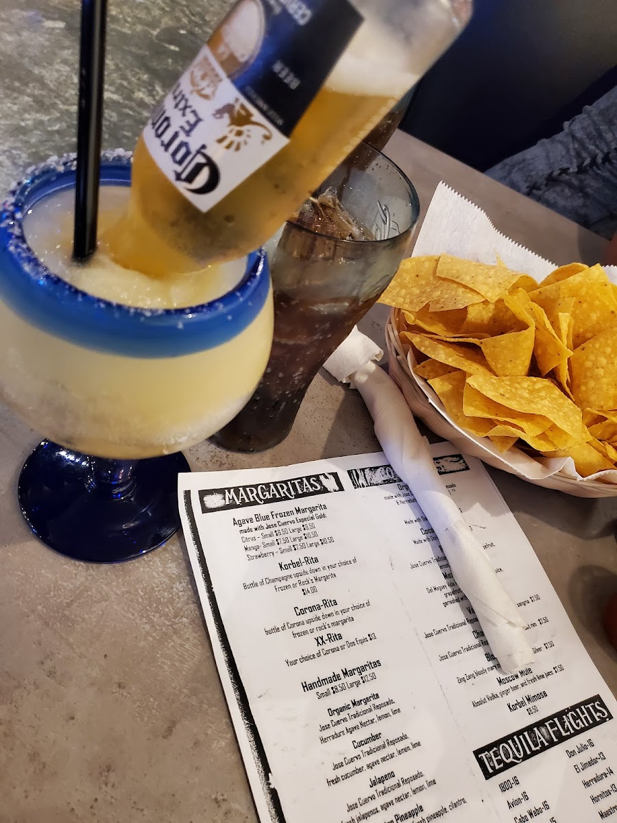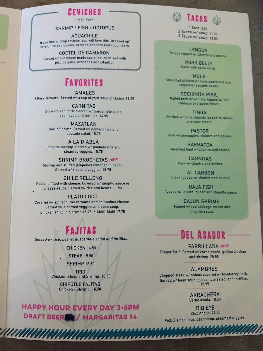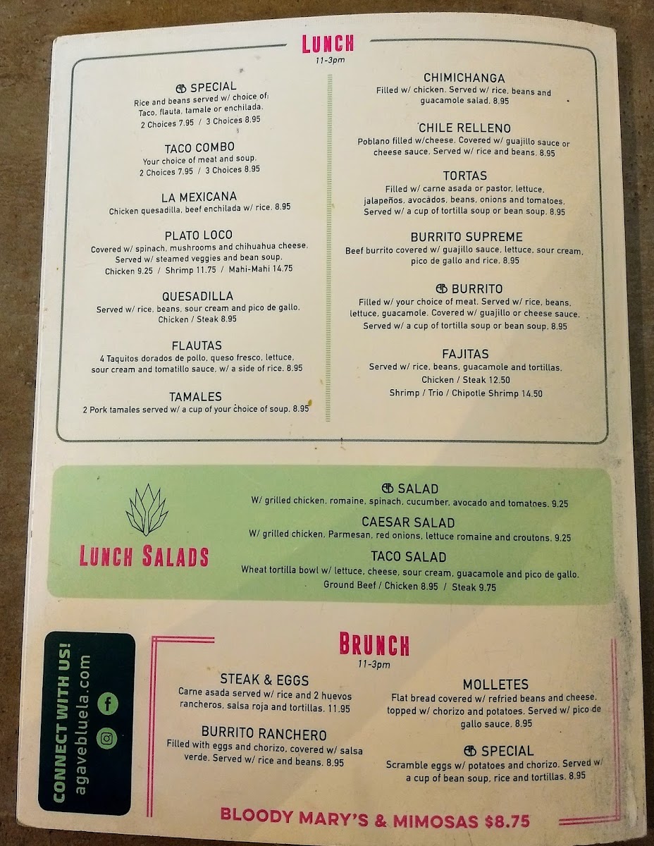 From a reviewer’s perspective, the menu at Agave Blue Tequila & Taco Bar feels like a well-rounded celebration of Tex-Mex and traditional Mexican cuisine, offering something for every appetite and occasion. The variety is impressive, starting with Tex-Mex staples such as La Mexicana, Quesadillas, AB Burrito, Burritos Supreme, and Flautas, before expanding into hearty handhelds and grills like Tortas, Burger, Trio Fajitas, Chipotle Fajitas, and Shrimp Fajita. The appetizer selection-including Queso Fundido, Elotes, AB Queso Trio, and Duck Empanadas-sets a flavorful tone, while the fresh ceviches like Coctel De Camaron, Octopus, Shrimp Aguachile, and Fish highlight the kitchen’s focus on bold, coastal flavors. Meat lovers are well taken care of with Rib Eye, Arrachera, Alambres, Molcajete, and Parrillada from the Del Asador section, balanced nicely by house favorites such as Tamales, Quesa-Birria, Plato Loco, Carnitas, and Chile Relleno. Taco enthusiasts can enjoy classics like Pastor, Carnitas, Cajun Shrimp, and Fish, while lighter options appear in AB Salad, Caesar Salad, AB Bowl, and Taco Salad. Families are not overlooked thanks to the Kids Menu with choices like Kid’s Cheeseburger, Kid’s Chicken Tenders, and Kid’s Taco. From brunch items such as Burrito Ranchero, Chilaquiles, and Breakfast Tacos to desserts like Sopapillas, Churros, Fried Ice Cream, and Flan, the menu comes together as a complete dining experience, making Agave Blue a destination where variety, comfort, and authentic flavors meet seamlessly.